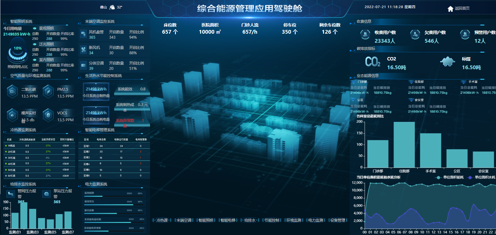 平臺(tái)實(shí)時(shí)監(jiān)控采集各院區(qū)中央空調(diào)系統(tǒng)耗電量、各樓宇用水用電量,通過(guò)遠(yuǎn)程控制、定時(shí)定量、數(shù)據(jù)分析、運(yùn)維管理、決策輔助等功能輔助醫(yī)院及時(shí)采取節(jié)能措施,降低空調(diào)能耗、減少人為能源浪費(fèi)、提升醫(yī)院能源智能化管理水平。